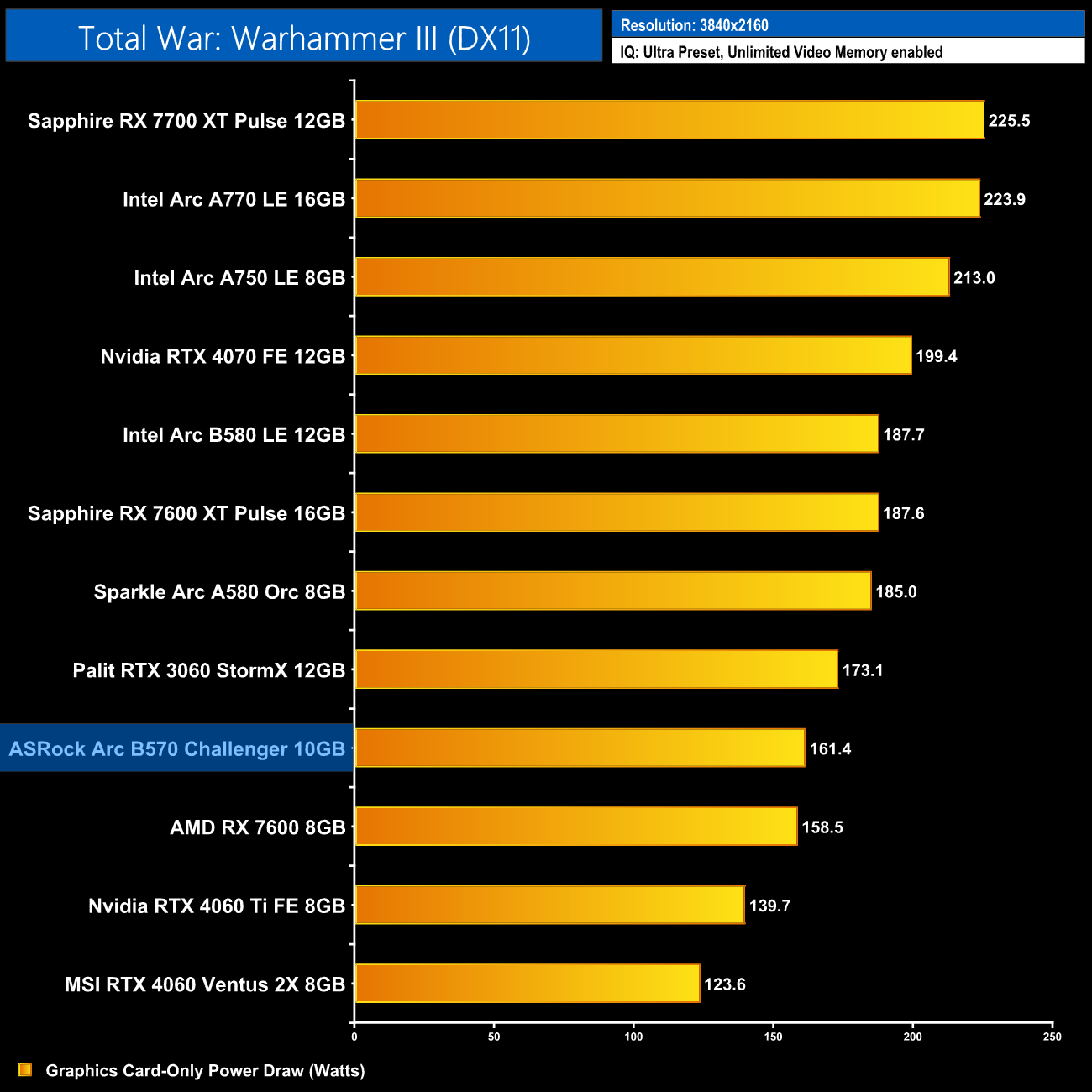 There's no such issue in Total War: Warhammer III, at 1080p the B570 is flying with 84fps on average, once again putting it 14% behind the B580, but it's within touching distance of the RX 7600 and RTX 4060.