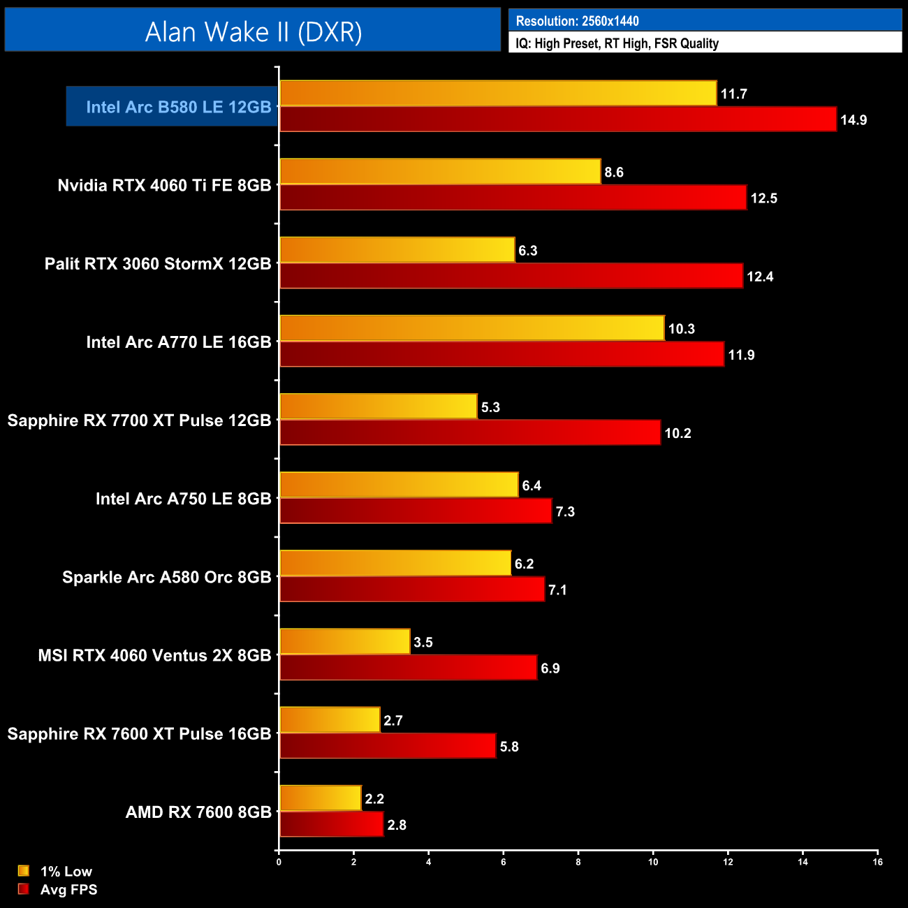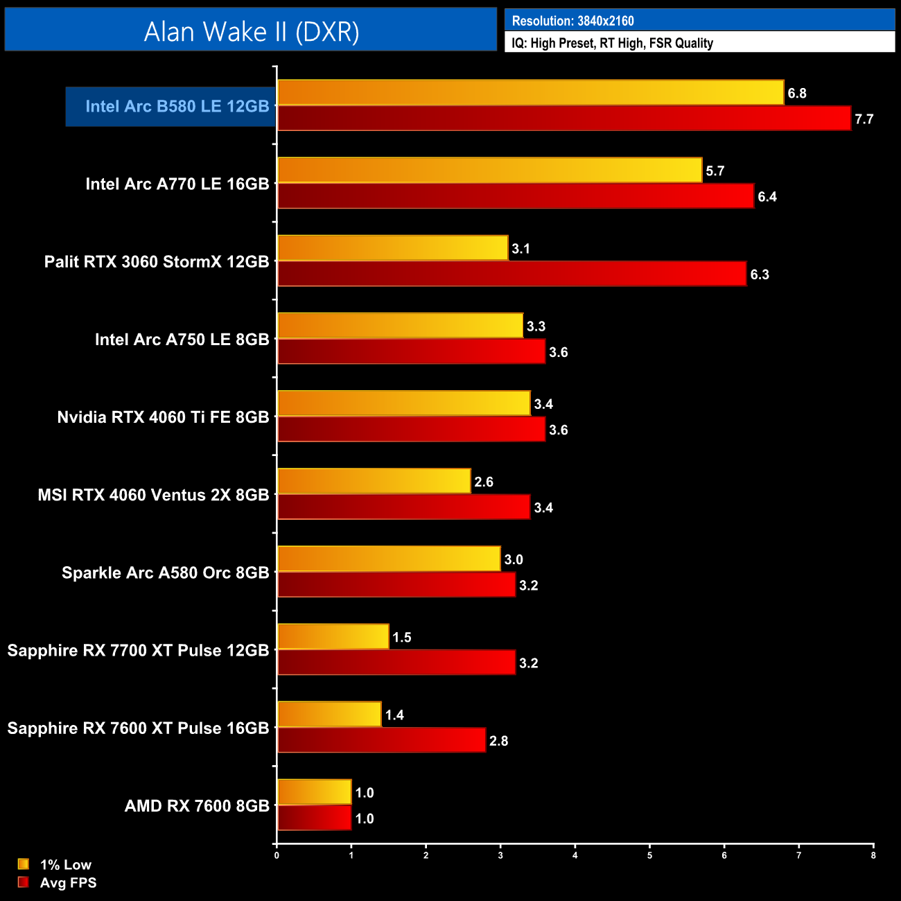 Starting our look at ray tracing performance with Alan Wake II, despite using Quality upscaling the B580 doesn't deliver playable frame rates at 1080p, falling to 23fps on average. We can clearly see it is streets ahead of the AMD competition however, and a whopping 62% faster than the A750, possibly due to its increased framebuffer. It's still 13% slower than the RTX 4060, though.