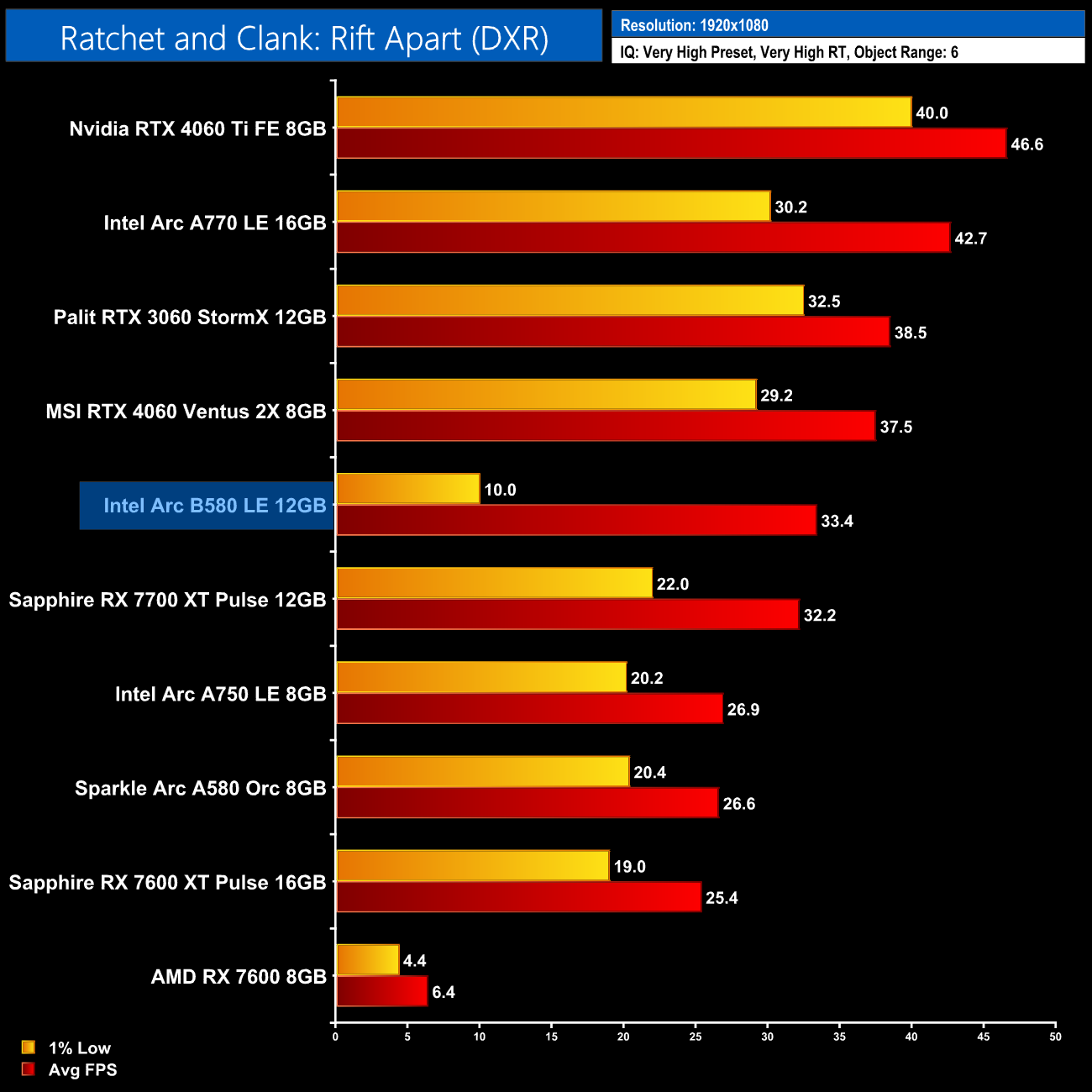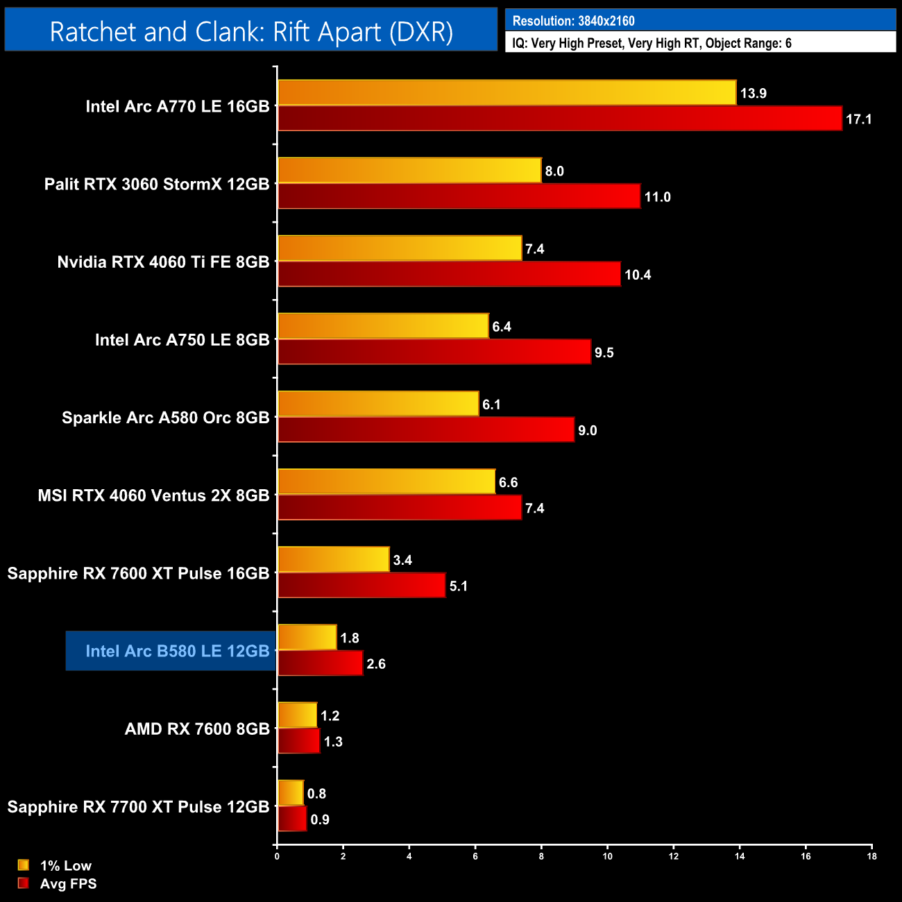 Unfortunately, Ratchet and Clank is yet another game where I encountered game-breaking issues. As shown in the video, every time I loaded into my save game to run a benchmark, the game slowed to a crawl and stuttered along for about 10 seconds, before it jolted into life and ran at seemingly normal frame rates. I have no idea why this was happening but it of course wrecks the benchmark numbers, and goes down as another issue that needs fixing.