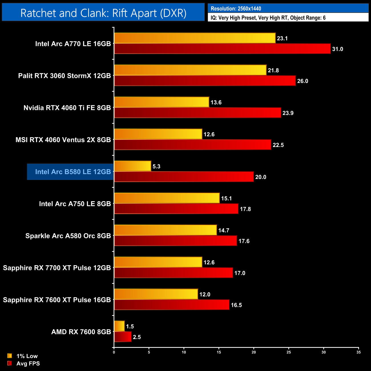 Engine: Insomniac Games in-house engine. We test using the Very High preset, Very High ray tracing, DXR API. DLSS/FSR are disabled.
