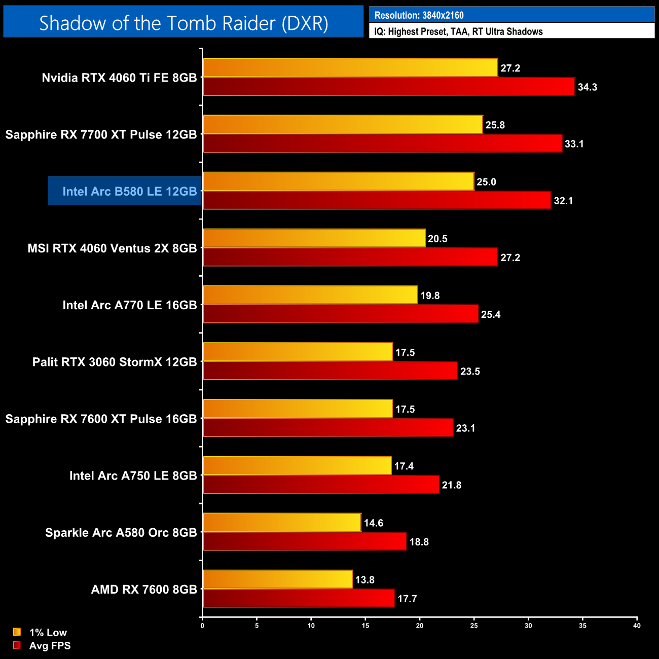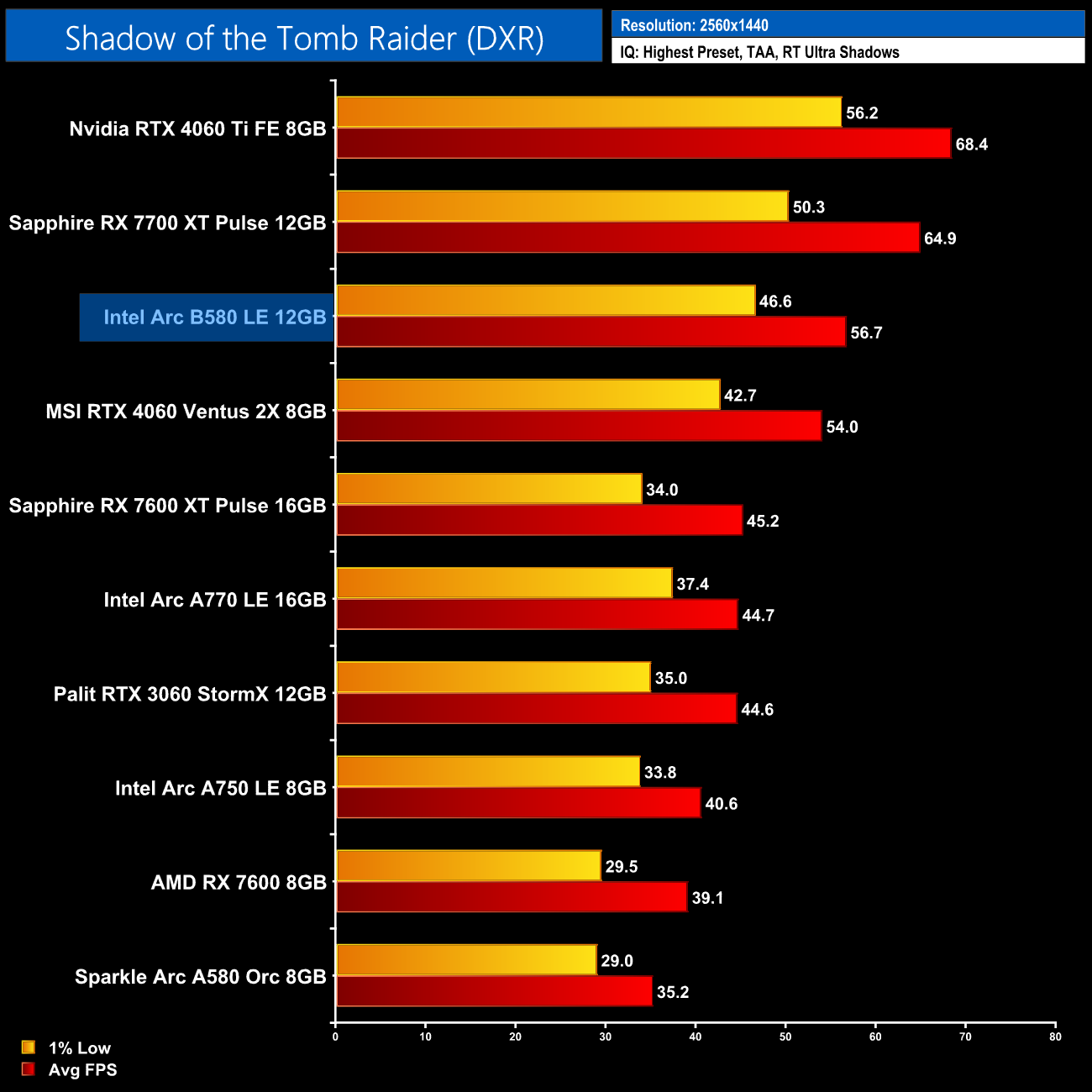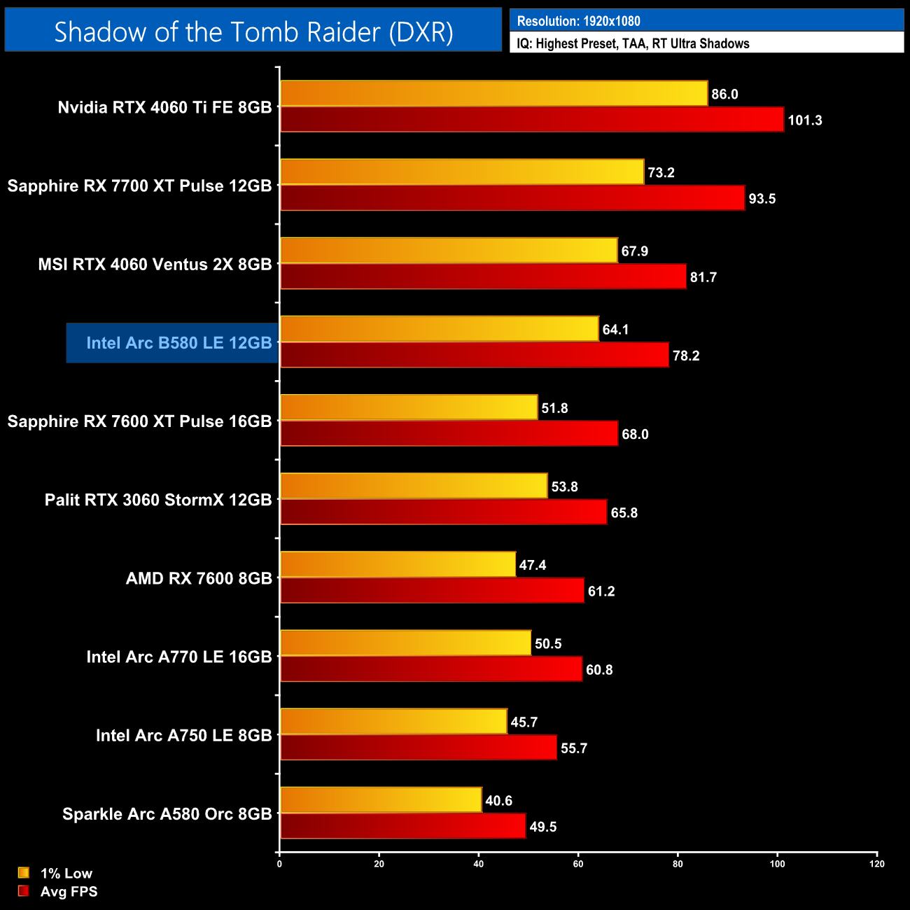 As for Shadow of the Tomb Raider, given it only incorporates ray traced shadows, this game is very light on ray tracing by modern standards. As such, the B580 is still able to hit 78fps maxed out at 1080p, and that makes it just 4% slower than the RTX 4060, but a good 15% faster than the RX 7600 XT.