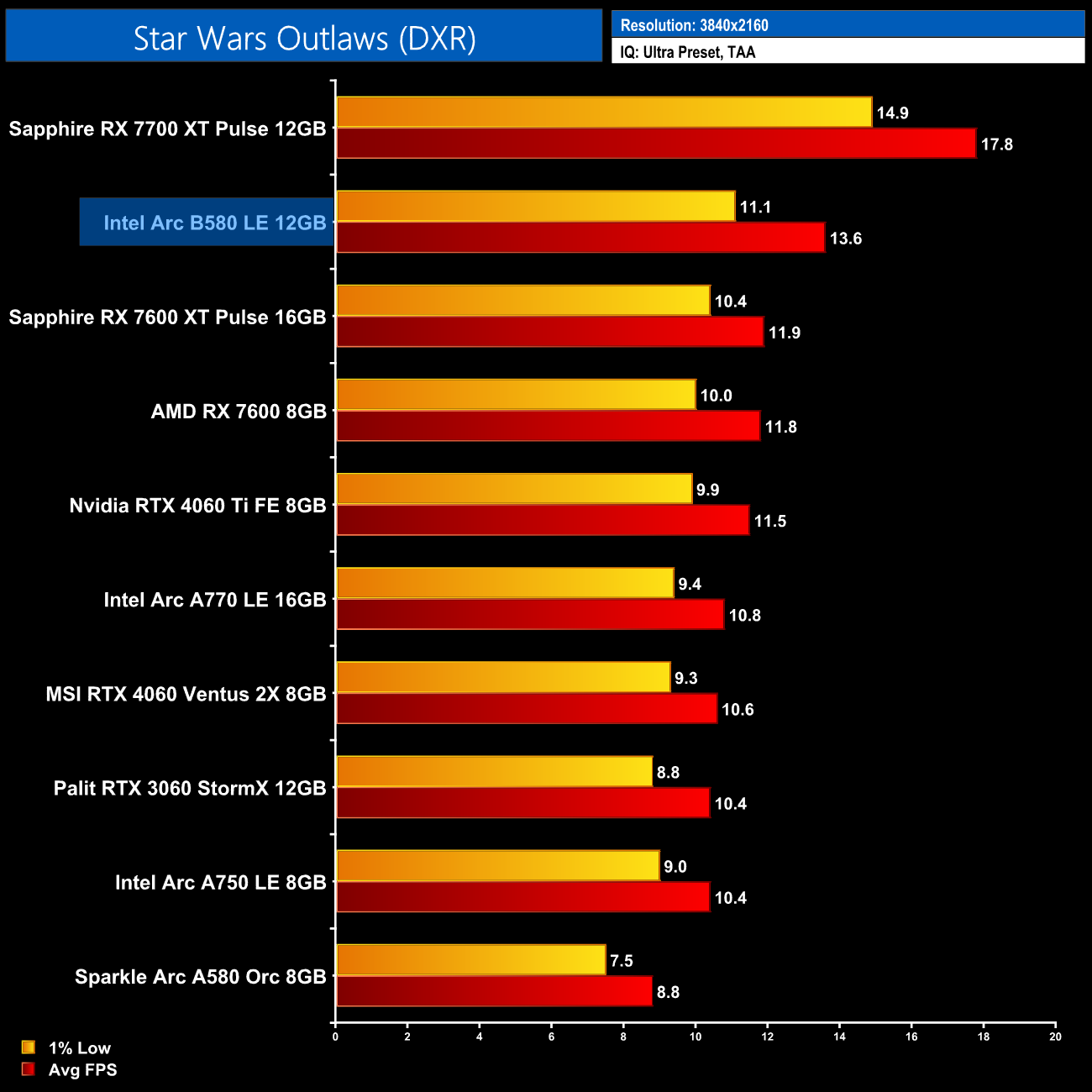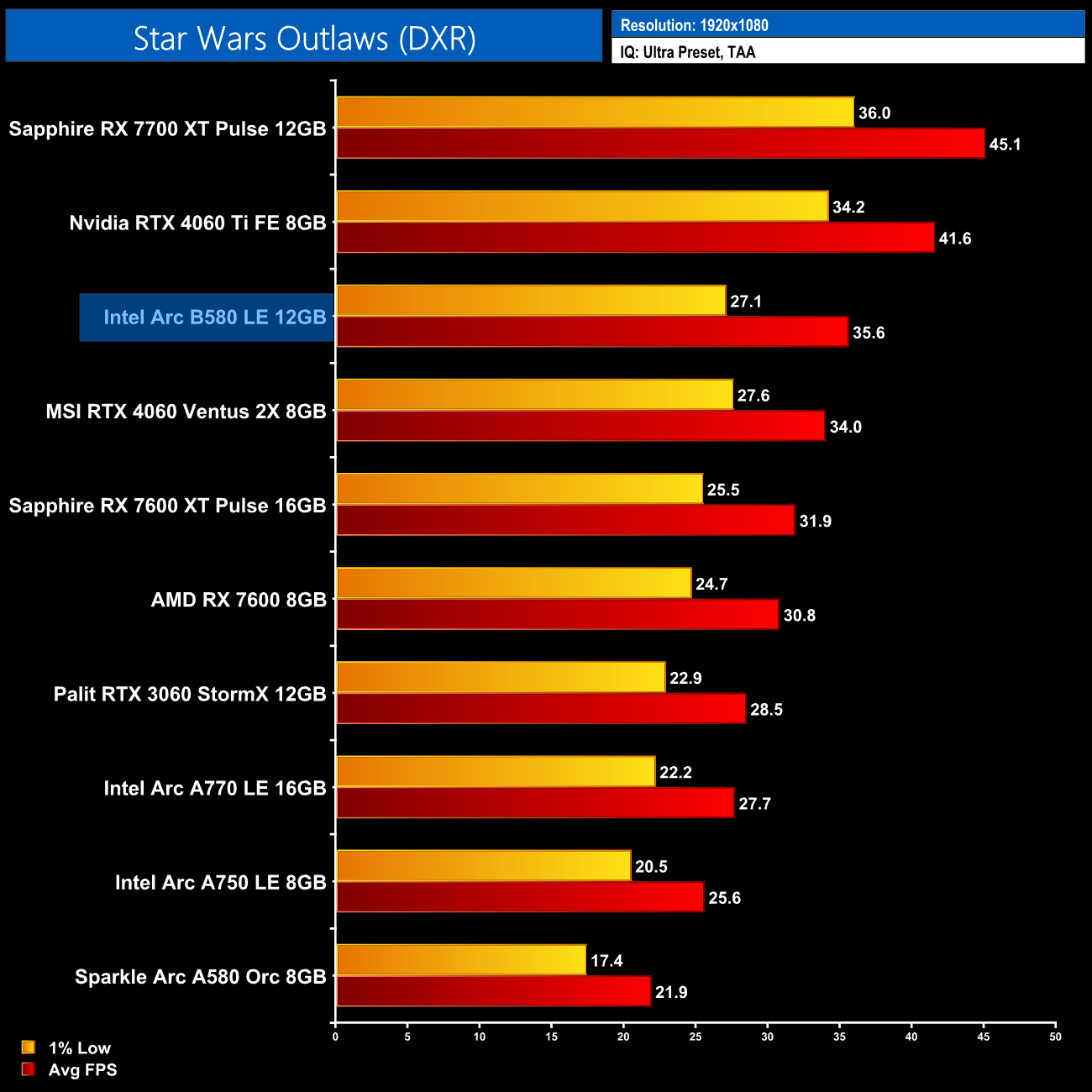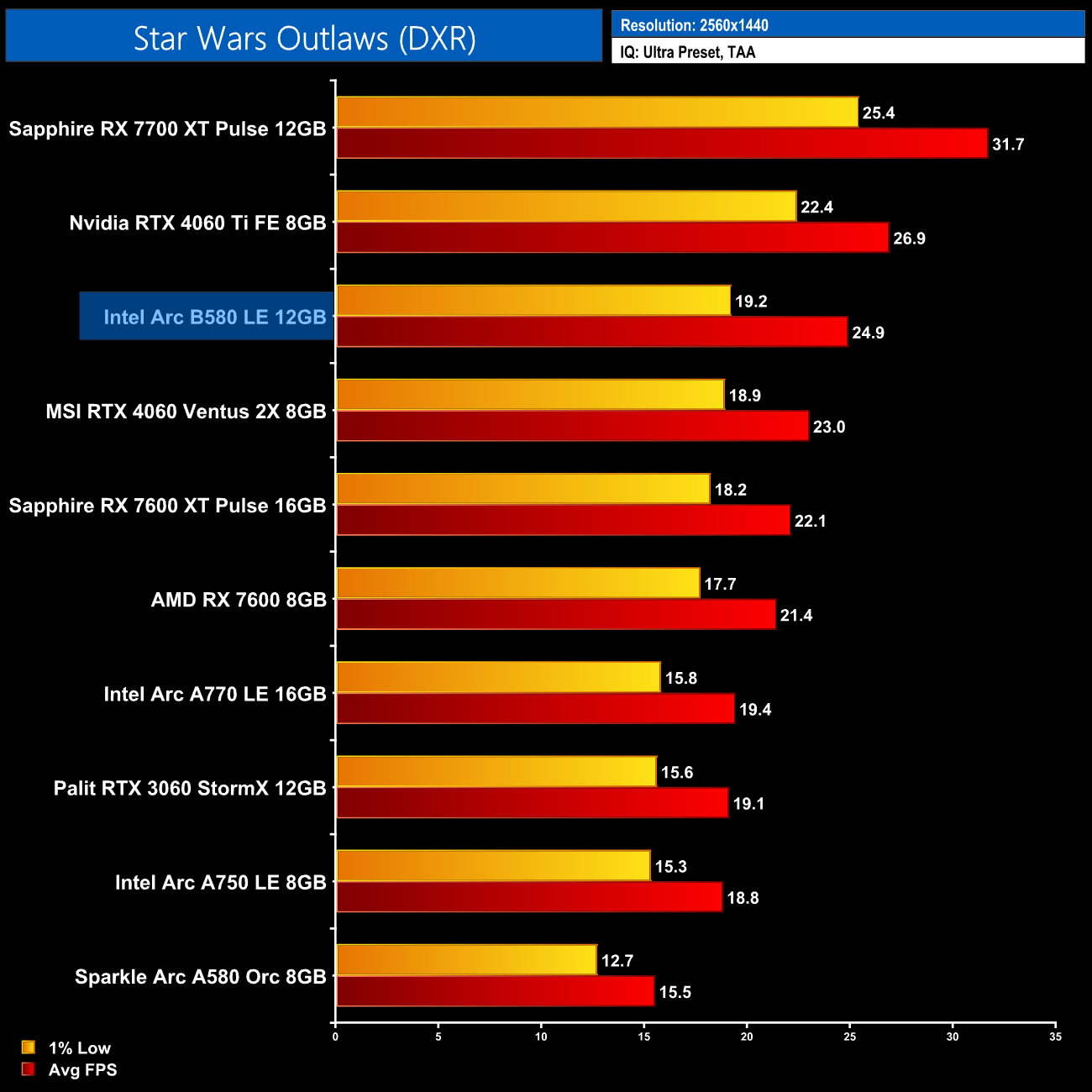 Lastly, we finish up with Star Wars Outlaws. This is another game that really tried my patience, as I simply could not go more than one benchmark run at a time without it crashing – even when using Intel's newest driver which supposedly fixes the issue. Again, like Cyberpunk 2077, the data is only really here as a guide, as in reality the game is simply not playable on the B580. Intel really needs to get things fixed up sooner rather than later.