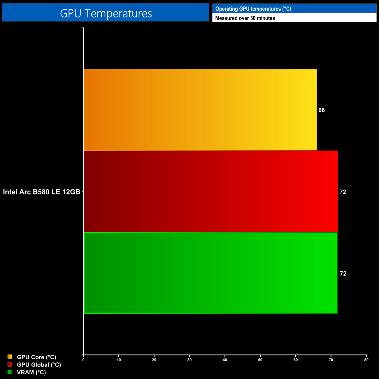 Thermally, the Intel-made Limited Edition is highly impressive. The GPU core hit just 66C after our thirty minute stress test, while both the GPU global and VRAM metrics hit 72C, so those are very low temperatures across the board.
