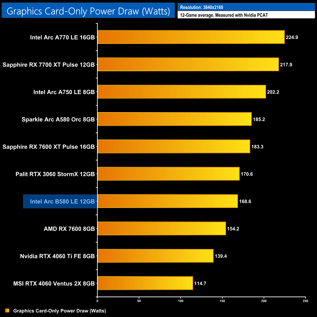 Here we present power draw figures for the graphics card-only, on a per-game basis for all twelve games we tested at 2160p (4K). This is measured using Nvidia's Power Capture Analysis Tool, also known as PCAT. You can read more about our updated power draw testing methodology HERE.