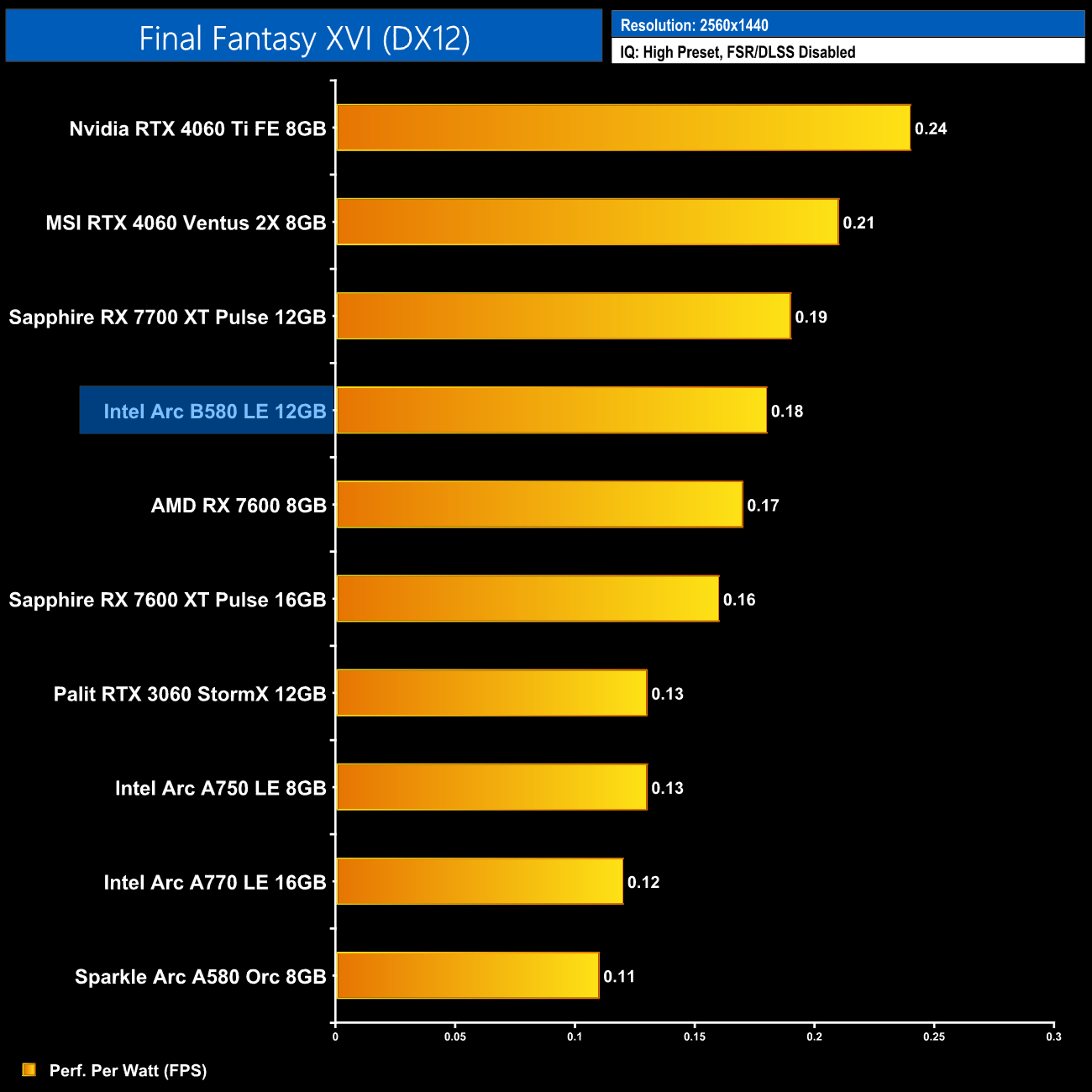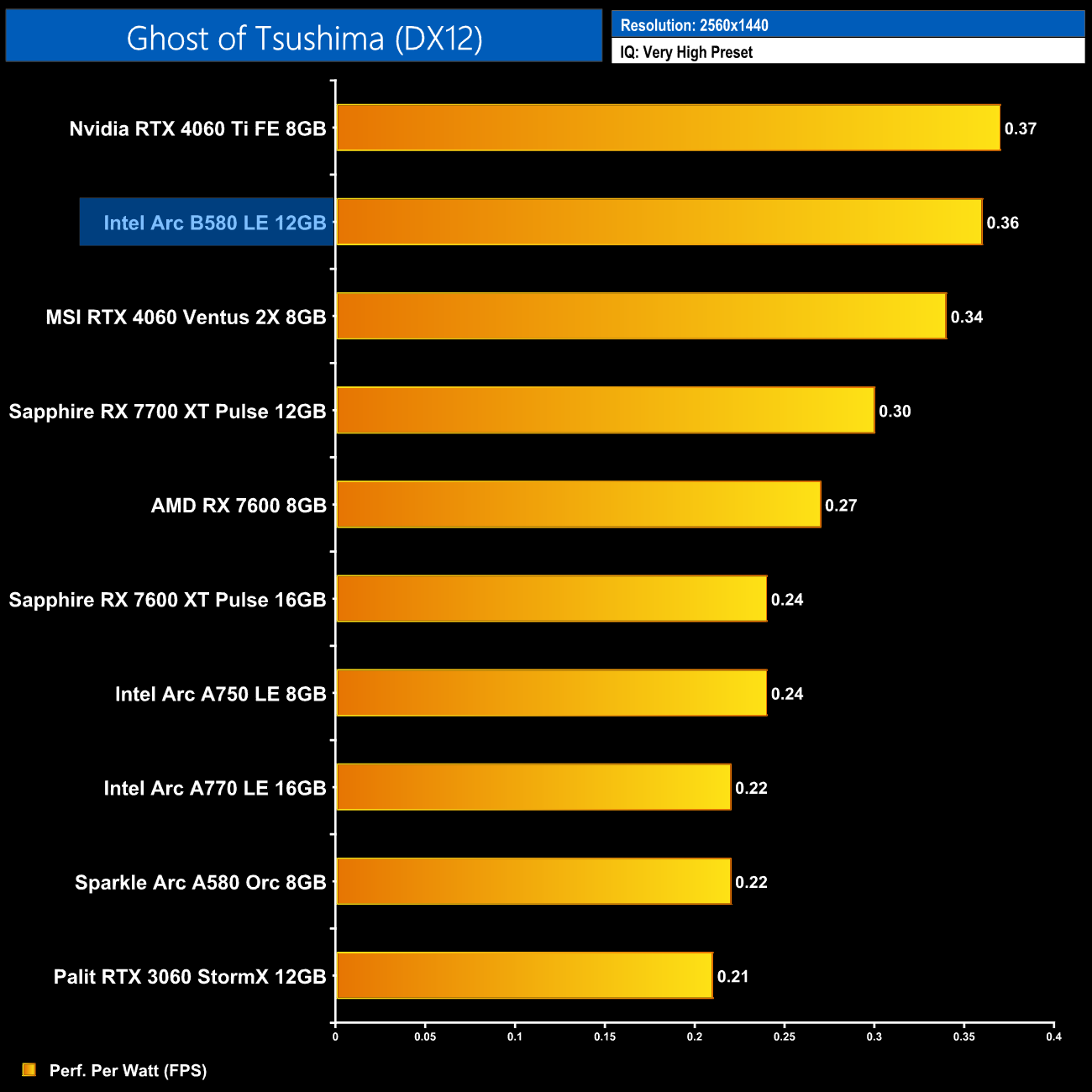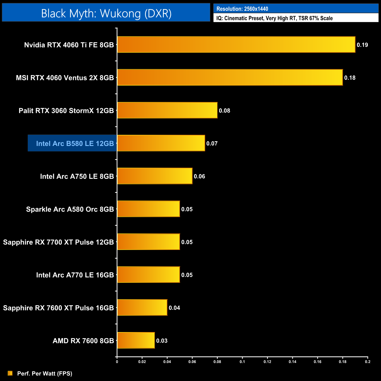 The overall trend stays the same at 1440p, too. We're again looking at exactly 50% more performance per Watt than the A750, though the B580 is 18% behind the RTX 4060 here.