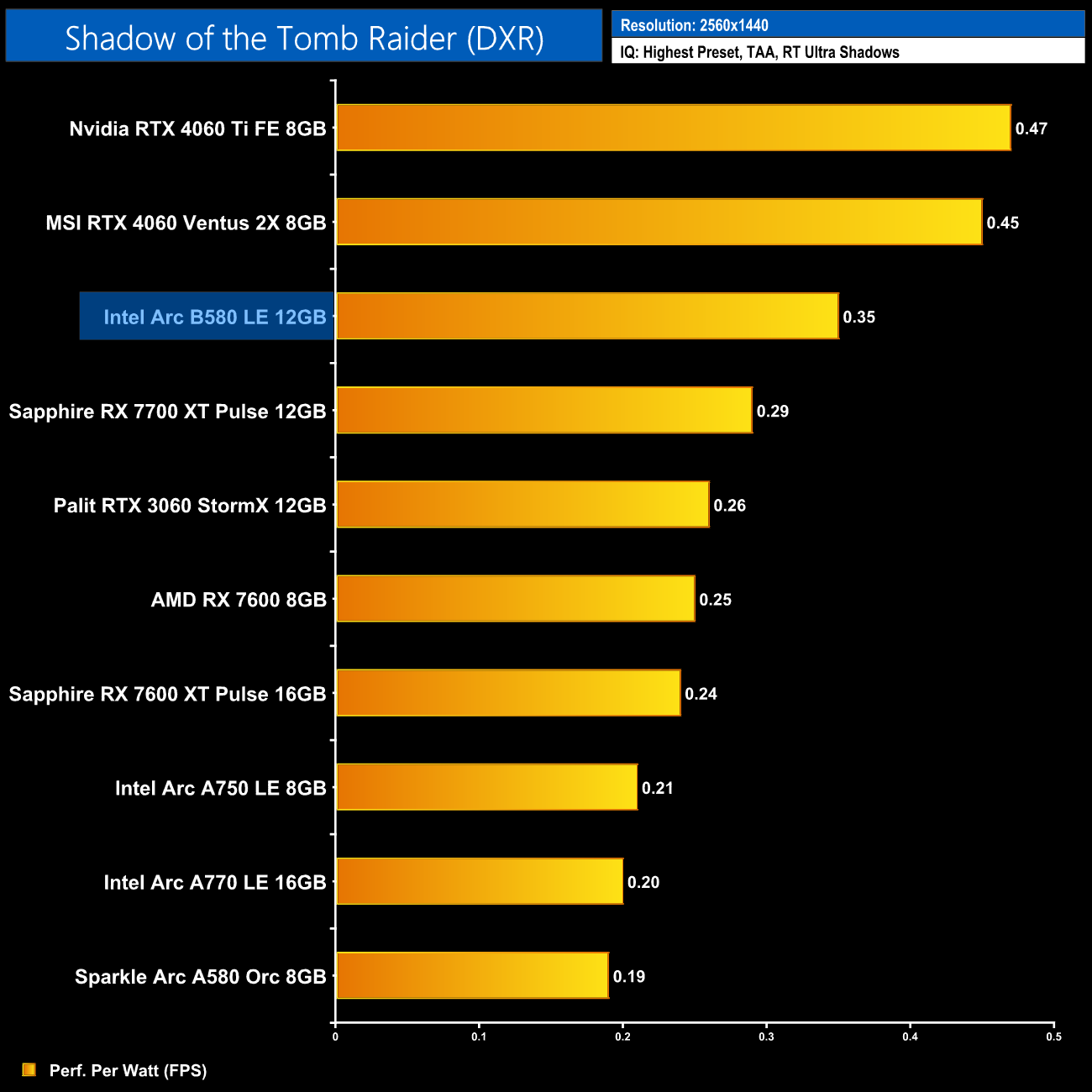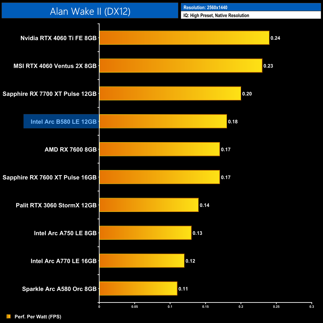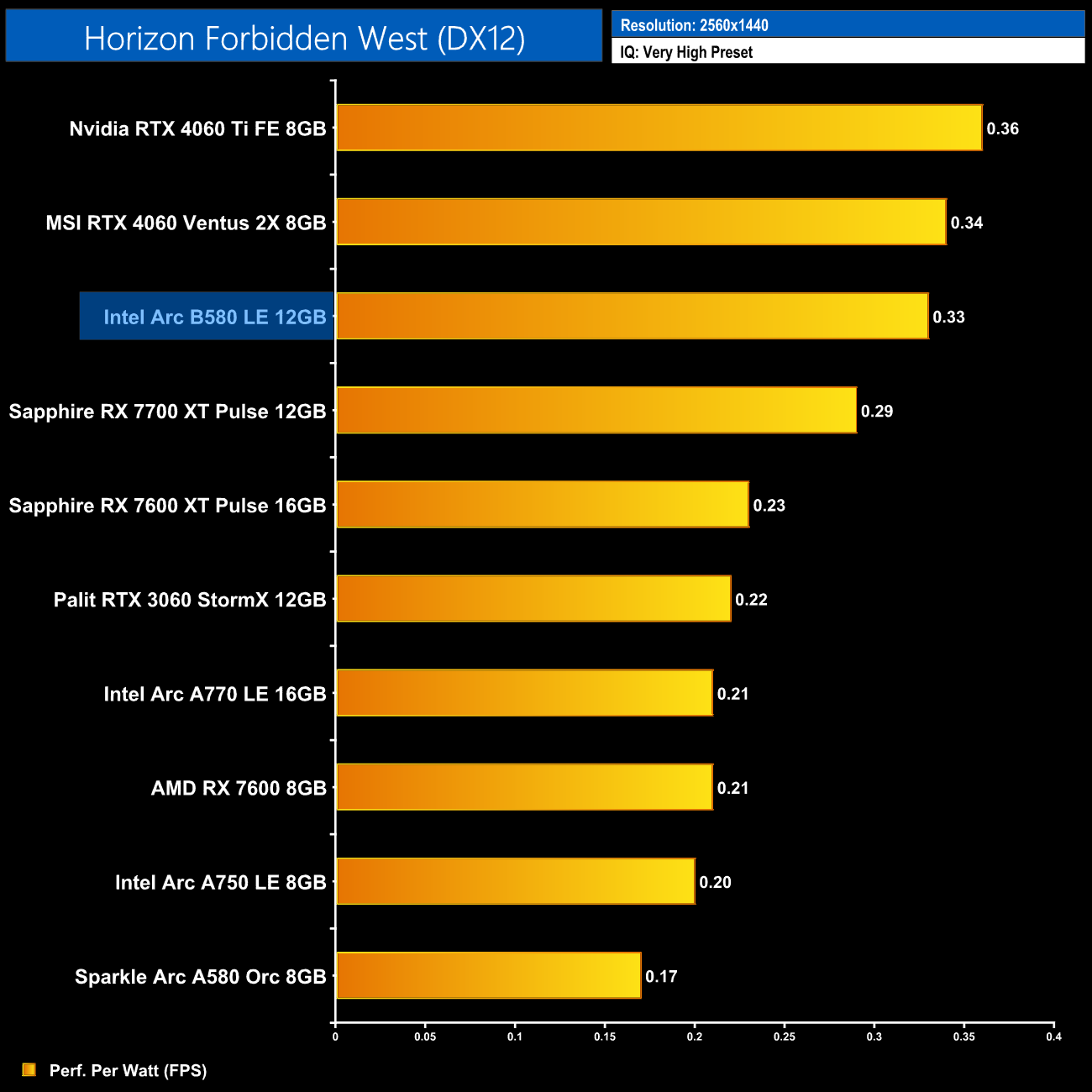 The overall trend stays the same at 1440p, too. We're again looking at exactly 50% more performance per Watt than the A750, though the B580 is 18% behind the RTX 4060 here.