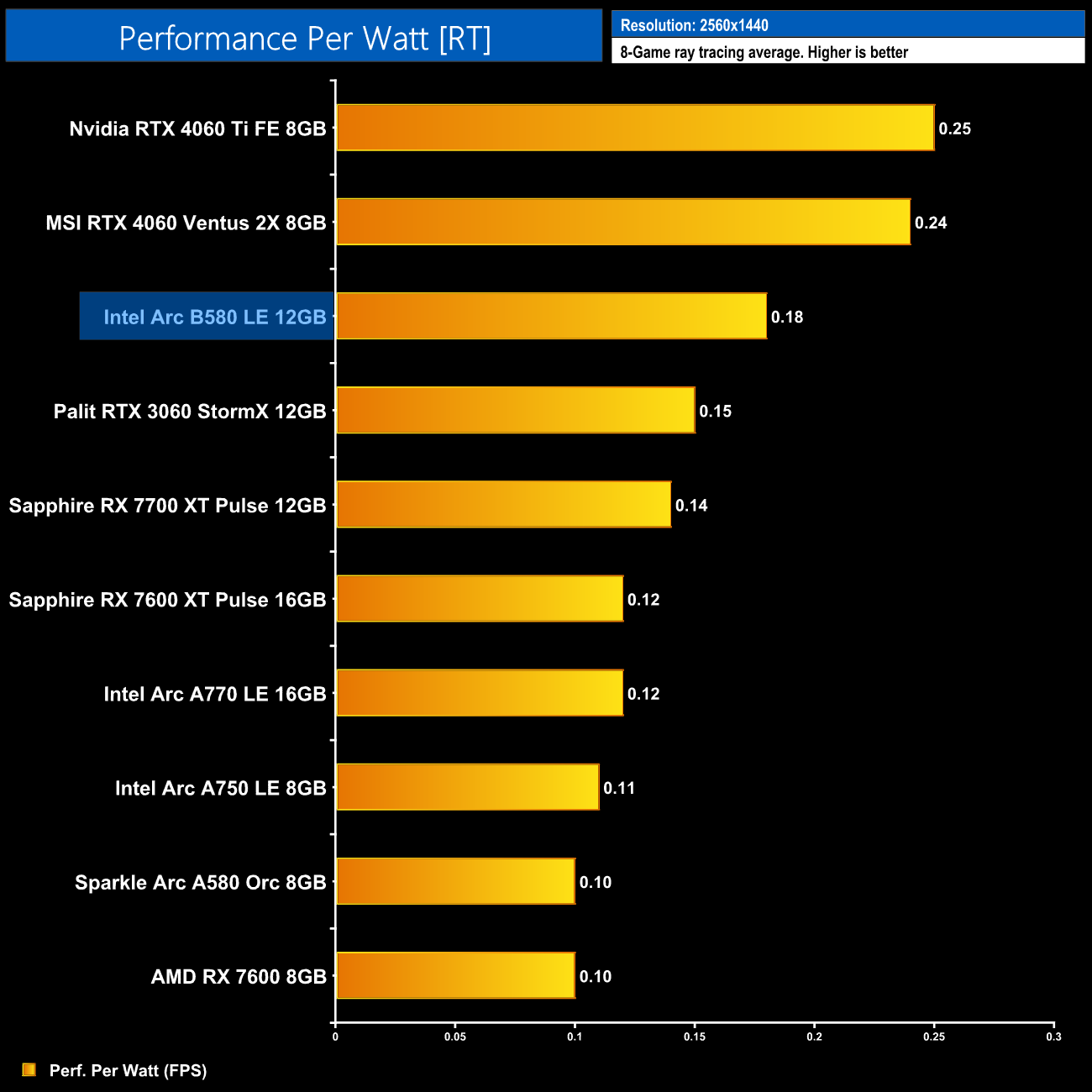 Nvidia widens the gap when looking at ray tracing efficiency, given the B580 is 25% less efficient than the RTX 4060.