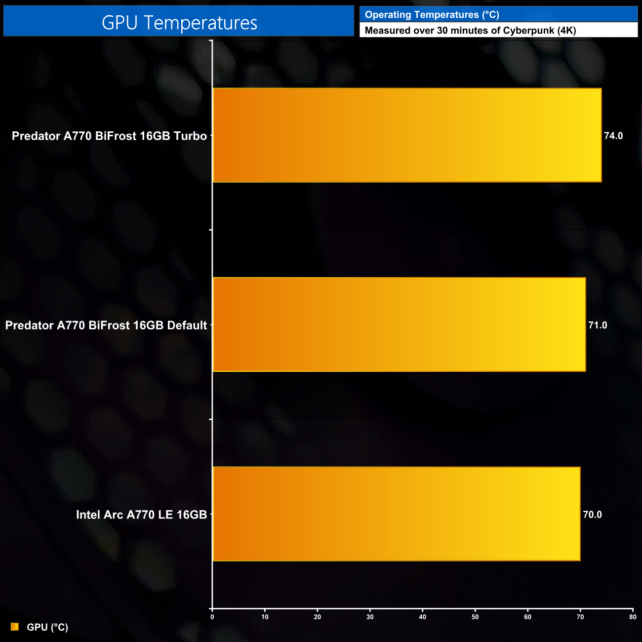 For our temperature testing, we measure the peak GPU core temperature under load. A reading under load comes from running Cyberpunk 2077 for 30 minutes.