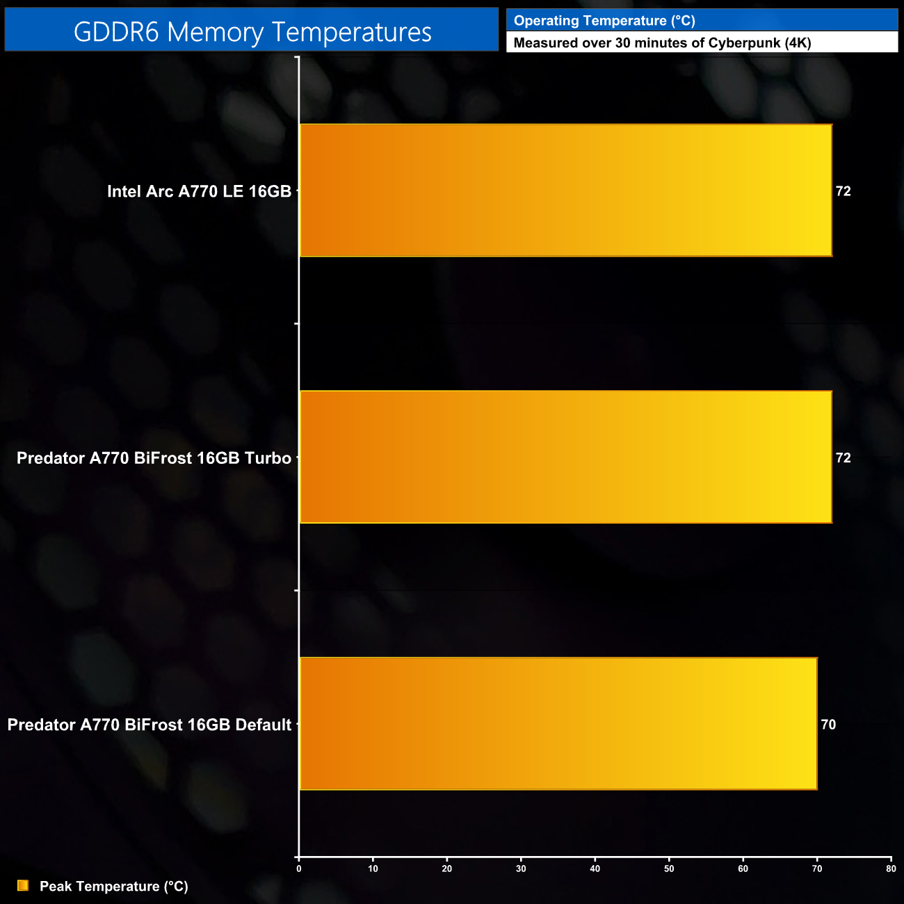 For our temperature testing, we measure the peak memory temperature under load. A reading under load comes from running Cyberpunk 2077 for 30 minutes.
