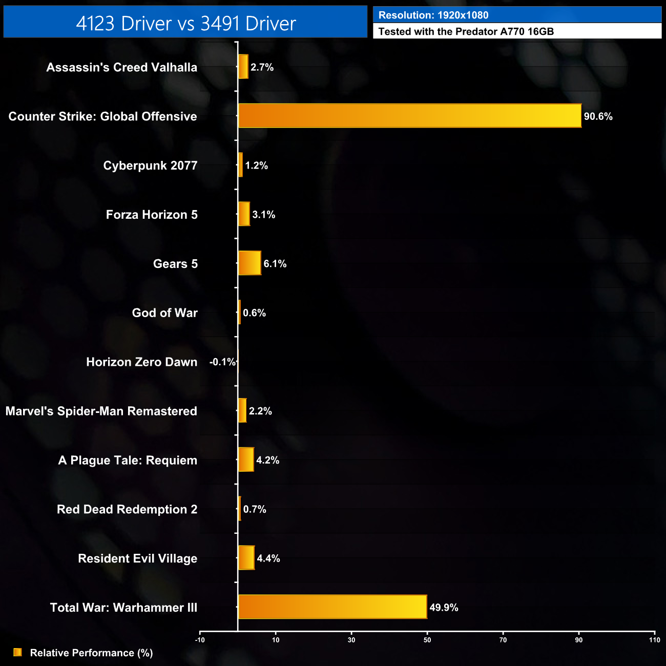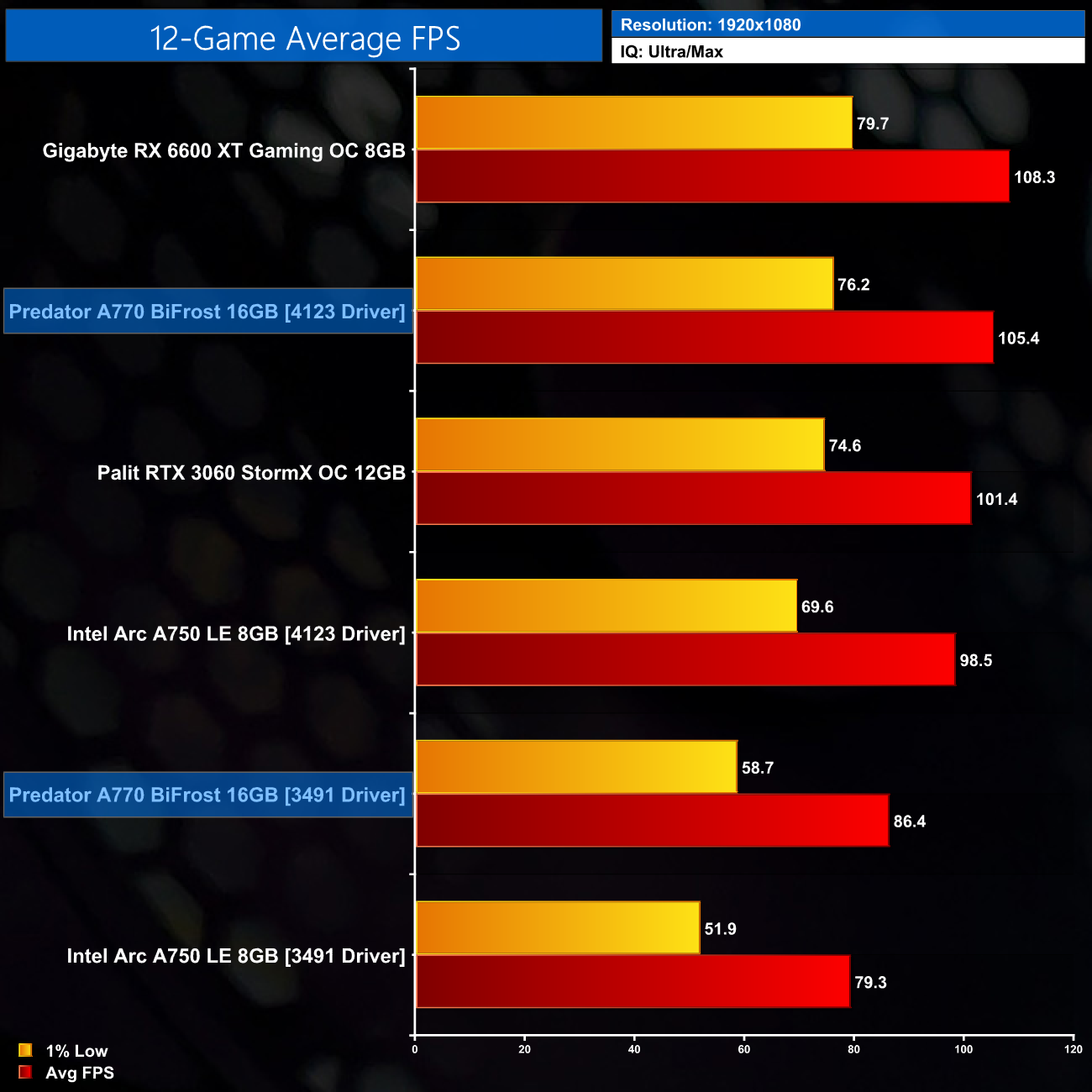 What these gains mean for Arc versus its competition is quite significant. Based on the 3491 driver, the Intel A770 made next to no sense when positioned against Nvidia's RTX 3060 – using that older driver, it came in 15% slower on average at 1080p. With the 4123 driver however, it’s on par if not marginally faster overall, while it is just behind AMD's RX 6600 XT in terms of overall performance at 1080p.