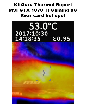 Moving on to our thermal camera images, we capture the hottest spots on both the rear and side of the card. Funnily enough, both spots came in at exactly 53C each – both excellent results which are well within thermal limits. Again, hats off to the Twin Frozr design.