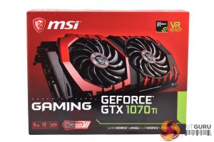 The MSI GTX 1070 Ti Gaming 8G ships in a red box, with a large photo of the graphics card itself splashed right across the front.