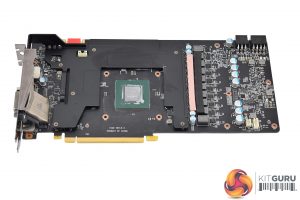 Now, turning the card back over, we get a look at the metal backplate. This should provide structural rigidity and also help dissipate some heat from behind the GPU core. It also looks pretty swish, too.