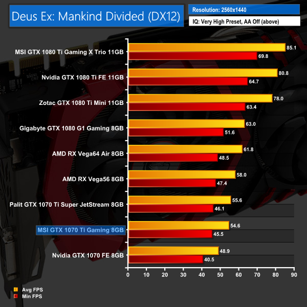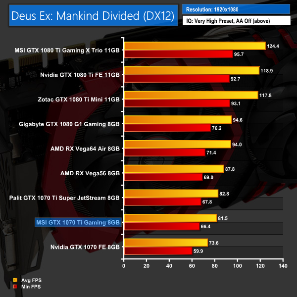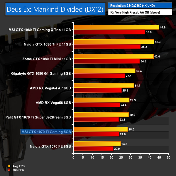 Deus Ex does favour AMD hardware so it is perhaps not a huge surprise to see the Gaming 8G lagging behind both Vega cards. The Palit 1070 Ti is again faster, however.
