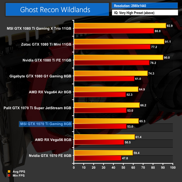 In Wildlands we see the 1070 Ti Gaming 8G nudge ahead of Vega56 across all three resolutions. GTX 1080 maintains a healthy performance lead.
