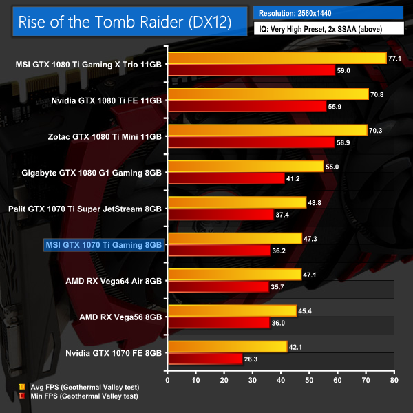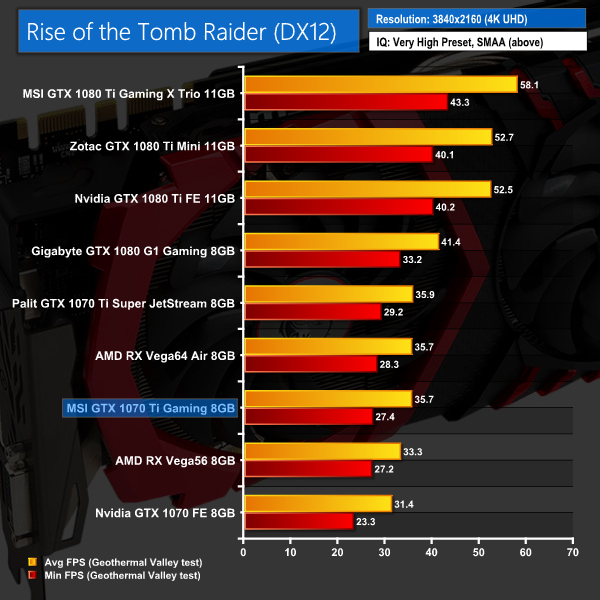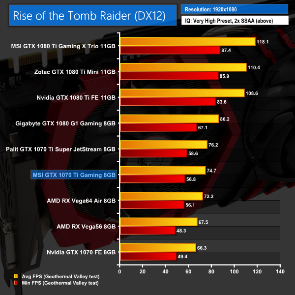 The last game on test today, ROTTR again shows a decent lead for the 1070 Ti over its main rival, Vega56. MSI's card has proved a couple of frames slower than the Palit Super JetStream 1070 Ti, though.