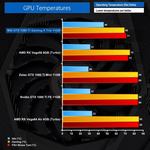 In terms of load temperatures, the Gaming X Trio performs fabulously – a peak reading of 71C is very impressive for a GTX 1080 Ti, so the triple-fan cooler clearly does the business.