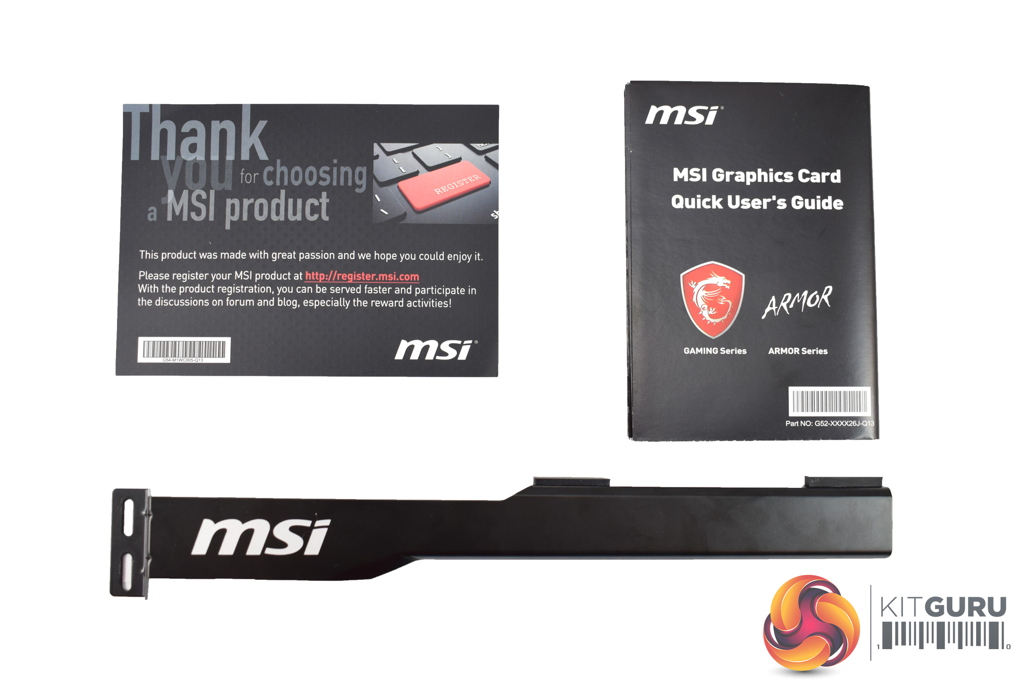 Inside, we get the usual thank you card, as well as a quick-start guide. However, more interesting is the metal support bracket that comes included. This is designed to prevent the dreaded ‘GPU sag' which is common among big-and-heavy graphics cards. There are third-party solutions on the market, but it is good to see MSI include something in the box.
