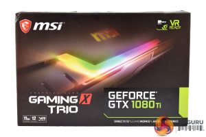 The MSI GTX 1080 Ti Gaming X Trio ships in a dark box, though there is a very bright and colourful photo of the card's RGB strip on the front.