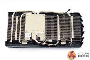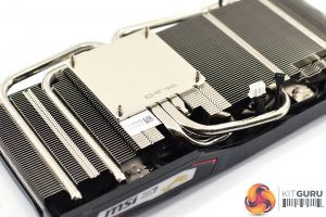 Lastly, as expected, the heatsink is again identical to that of MSI's GTX 1660 Ti Gaming X. That means it uses a single aluminium fin stack, with a total of 3 nickel-plated copper heatpipes, each of which measures 6mm. The GPU die contacts with a sizeable coldplate, too.