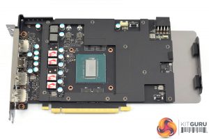 Taking the card apart only requires the removal of four screws from the back of the card. MSI is using another die-cast metal frame to cover most of the PCB, though, and this acts as a heatsink for the VRAM chips as well as the MOSFETs.