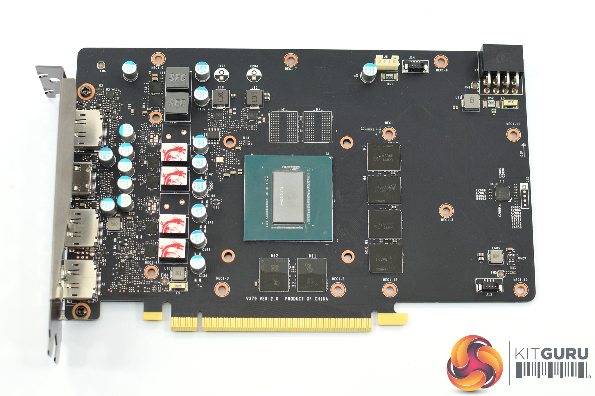 When we remove this frame and get a look at the PCB itself, and to my eye it remains effectively unchanged from the PCB of the GTX 1660 Ti Gaming X, which makes sense since it is the same GPU. That means MSI retains 4+2 phases for the power delivery, and we still get 6GB of VRAM from Micron. Remember, though, the memory is GDDR5, not GDDR6, and the chips are labelled ‘8KB77D9VVR'.
