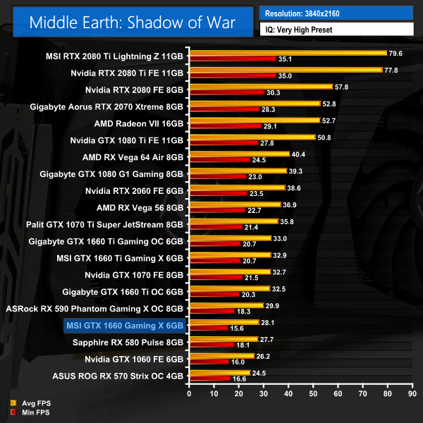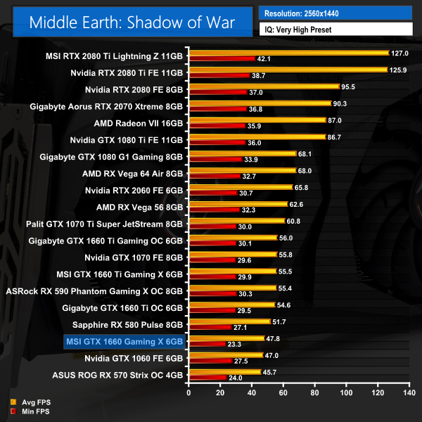 Now, this is where I have to scratch my head – for an as yet unknown reason, the MSI GTX 1660 performs marginally worse than GTX 1060 at 1080p, and then barely any faster at 1440p. This is clearly an anomaly as 1660 has (and should) outperformed 1060 across all of our other tests. Yet, no matter how many times I ran the benchmarks – I tried re-installing the driver, re-seating the card etc – the results stayed the same.