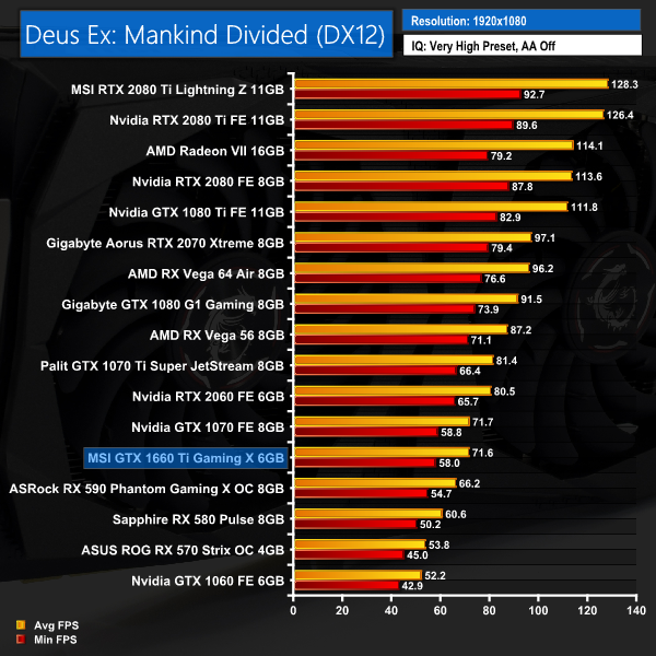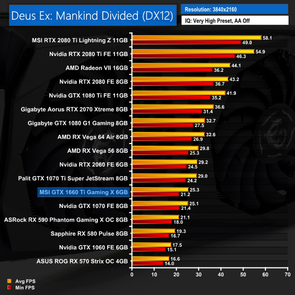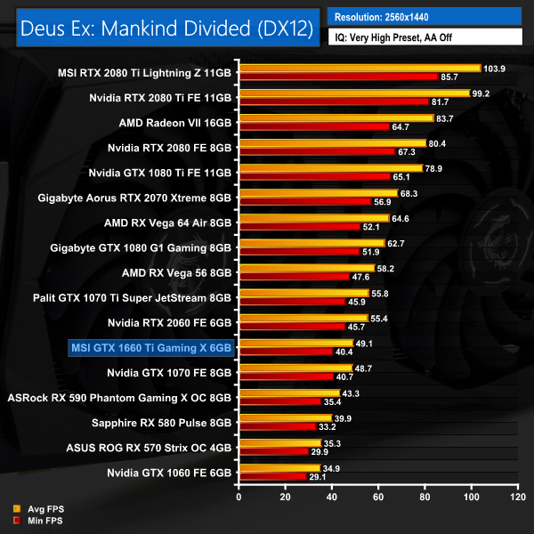 Deus Ex: Mankind Divided has both the GTX 1660 Ti and GTX 1070 essentially on par with each other – across all three resolutions tested, the cards perform within 1FPS of each other. More interesting, I would argue, is how close that puts the 1660 Ti to the RTX 2060 – the gap at 1440p is just 6FPS, for instance, which isn't much at all.