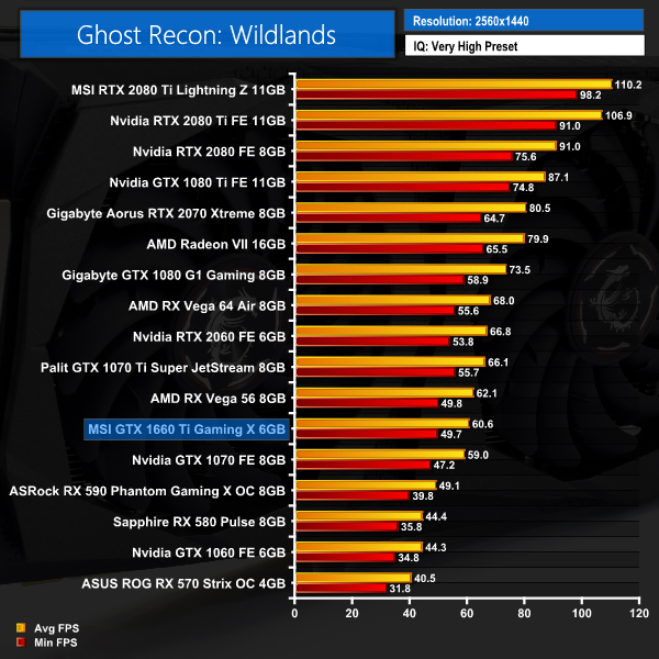 Ghost Recon: Wildlands definitely favours Nvidia hardware over AMD, and we can see that in the 1080p and 1440p results where GTX 1660 Ti is effectively tied with Vega 56. That in turn puts 1660 Ti performance at pretty much the same level as GTX 1070 in this title.