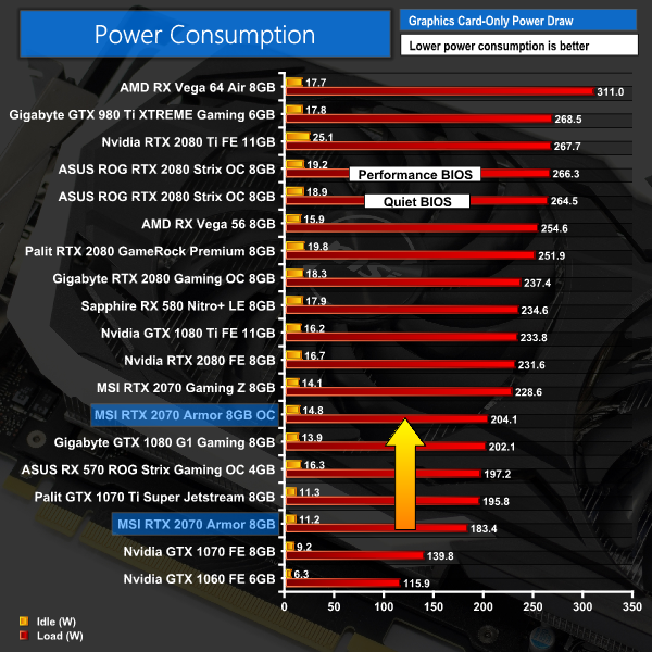 The Armor 8G card was easily able to handle this hefty overclock. It ran 4C hotter than when at stock clocks, but its peak temperature was still just 69C which is impressive for a relatively basic card like this. Noise levels, too, only rose an extra decibel or so, while power consumption figures jumped 21W to 204W total – which is still a very respectable figure, and less than the Gaming Z drew at stock clocks.