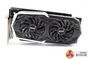 The card itself is pretty simple in terms of its design. The plastic shroud uses a black and white colour scheme that is a staple of the Armor series, and on the front we find two Torx 2.0 fans. This is one area where MSI is trying to keep costs down with the Armor 8G – its higher-end models now use Torx 3.0 fans, so the older fan used here just serves as a reminder that this is not a flagship model.