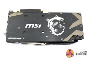 The brushed metal backplate is predominately black, with the MSI branding and dragon logo printed in white. There are also some grey accents at the far end of the card, but it is overall very monochrome in design.