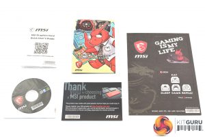 Inside, several accessories are included, with the bundle made up of: 1x driver disc, 1x product registration card, 1x quick start guide, 1x Lucky the Dragon cartoon, and 2x MSI coasters.