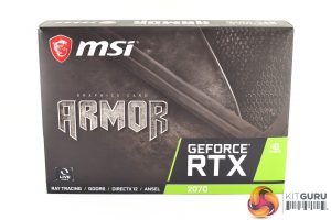 The MSI RTX 2070 Armor 8G ships in a dark grey box that appears to show an image of a knight's breastplate on the front – tying in with the ‘Armor' name. There is no image of the card itself present on the front of the box.