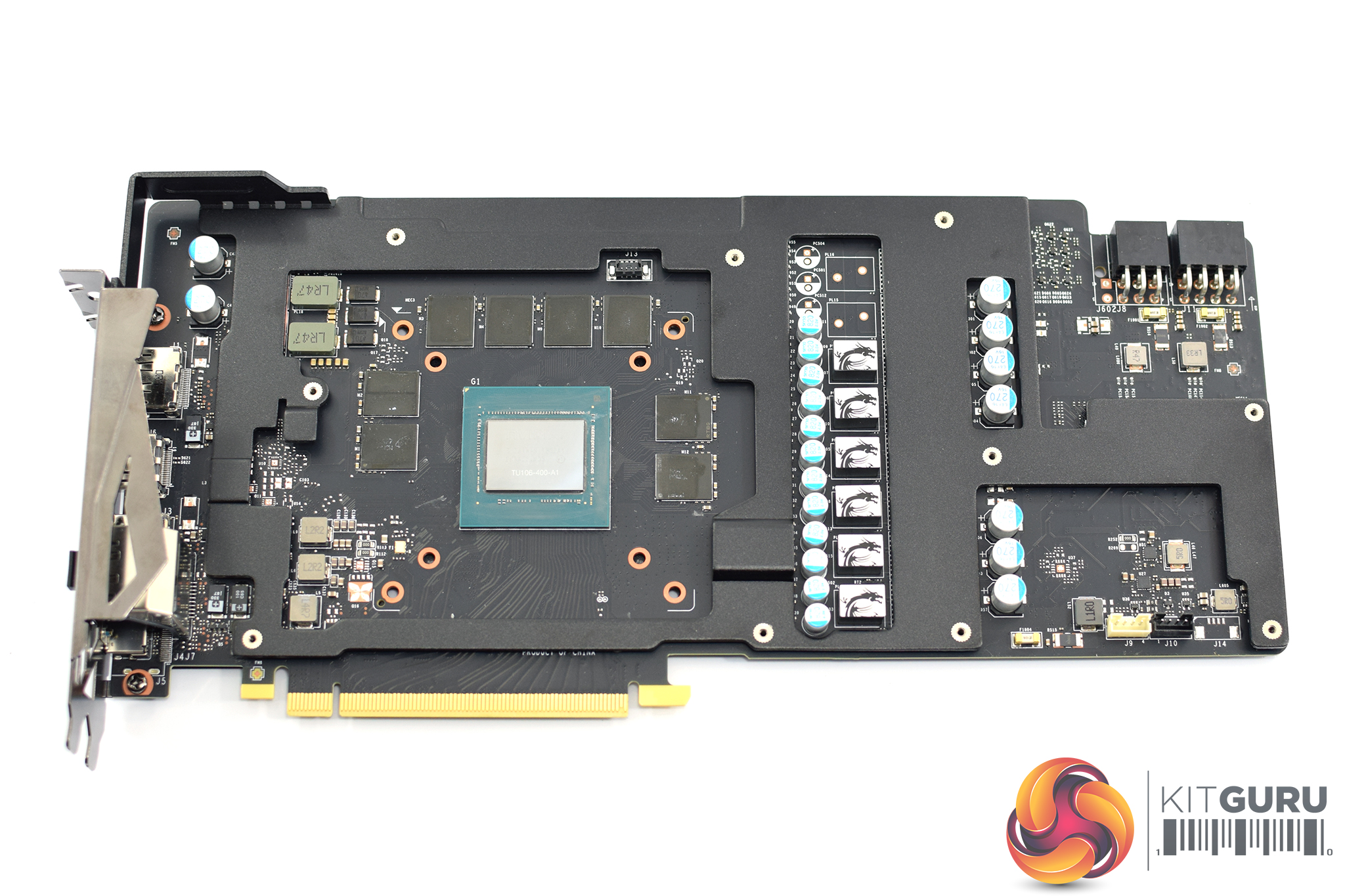 Taking the card apart requires the removal of 14 screws from the back of the card, and then we are presented with the PCB. A metal frame covers most of the circuit board and is screwed into the I/O bracket to provide extra rigidity and prevent sagging.