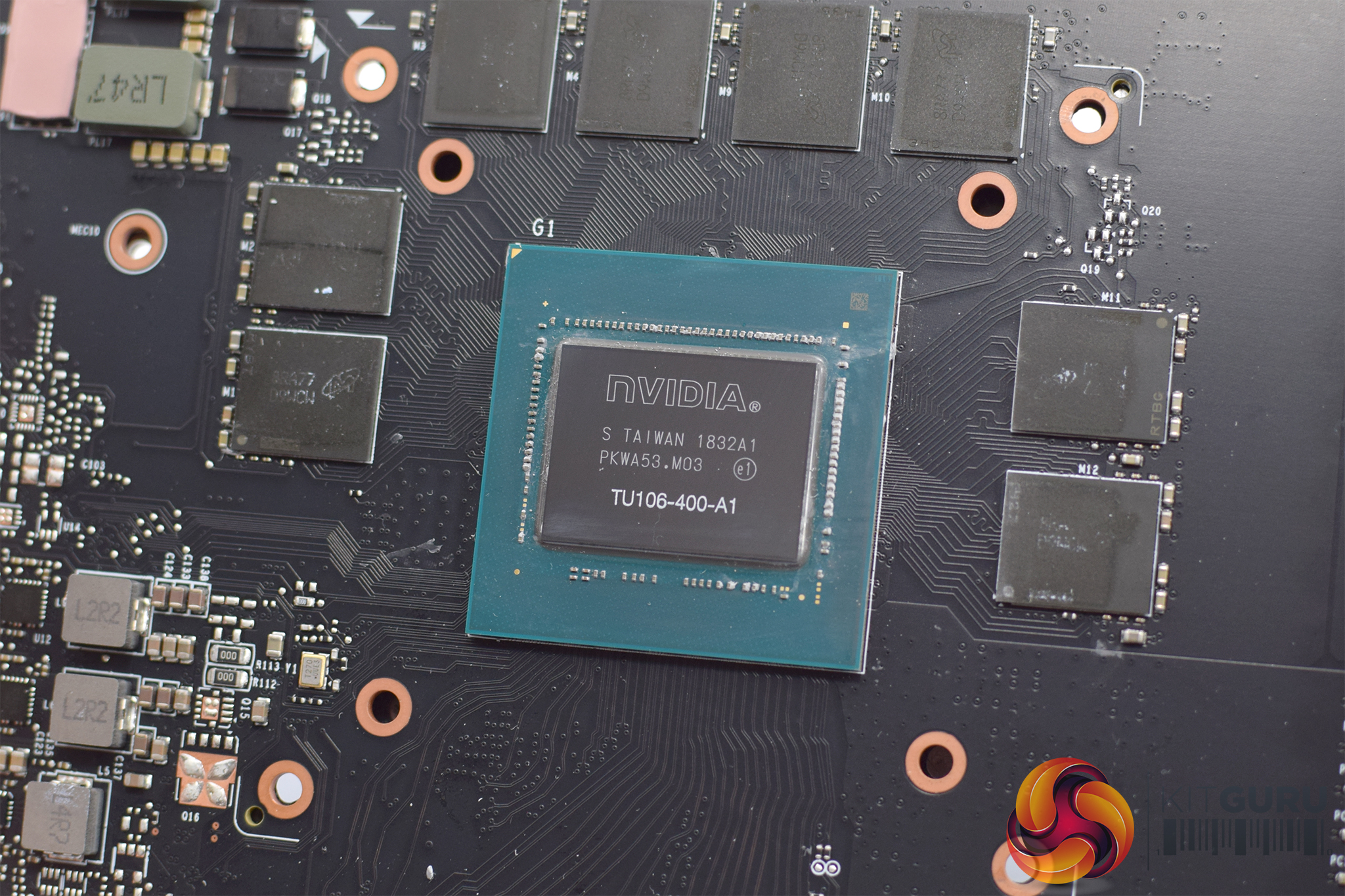 The GPU die itself is labelled ‘TU106-400' – meaning this is a ‘non-A' chip. Nvidia bins its GPUs into ‘A' and ‘non-A' piles, and the non-A chips have to be sold at reference speeds, as is the case here. Manual overclocking is still an option, but Nvidia's partners can't apply a factory overclock to the non-A chips.