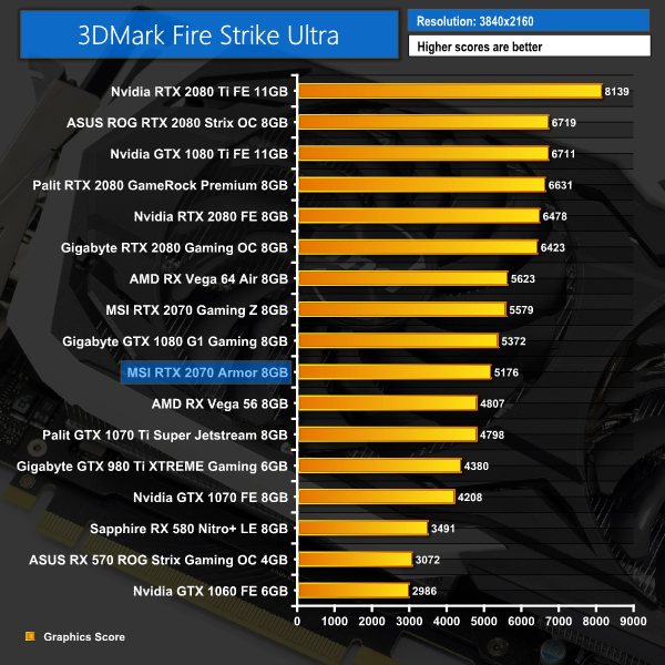 As expected, the Armor 8G 2070 falls behind its faster sibling, the RTX 2070 Gaming Z, in all three of our 3DMark tests. It is also marginally slower than the GTX 1080 in Fire Strike and Fire Strike Ultra, but does pull ahead in the DX12 Time Spy test.