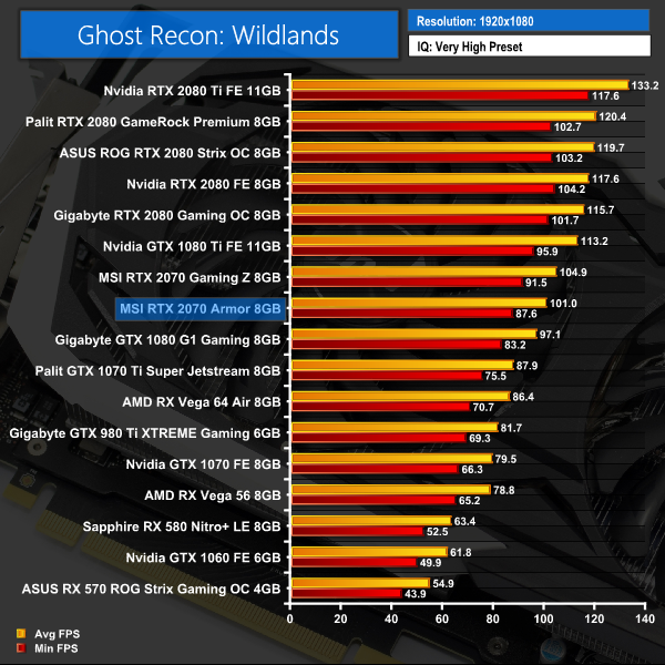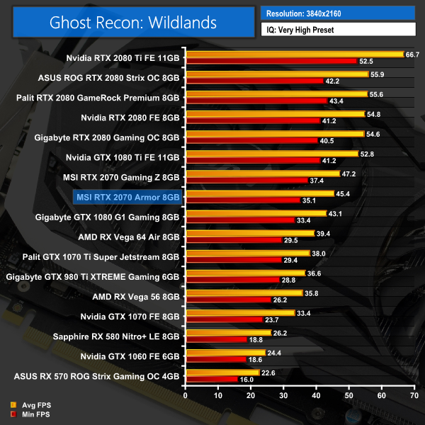 Ghost Recon: Wildlands again has the RTX 2070 Armor 8G ahead of the GTX 1080, with the gap being almost 4FPS at 1440p.