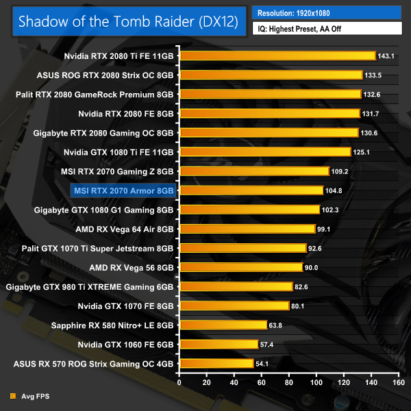 Our last game today, Shadow of the Tomb Raider confirms this Armor 8G RTX 2070 as the faster card when compared to the GTX 1080. It edges ahead at all three resolutions tested.