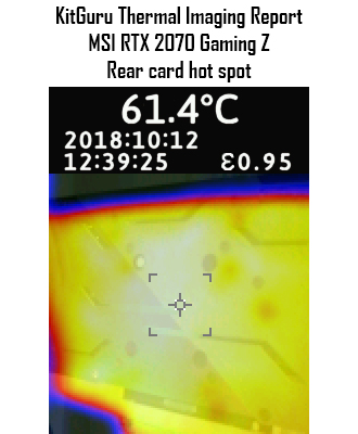 Our thermal gun shows excellent results as well, with a peak of just 64.4C on the front of the card, and 61.4C on the back – not surprisingly, this reading was taken from the area directly behind the GPU core. Still, both results are fantastic and show the 7th gen Twin Frozr cooler is certainly up to the task.