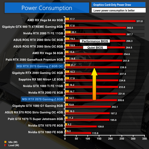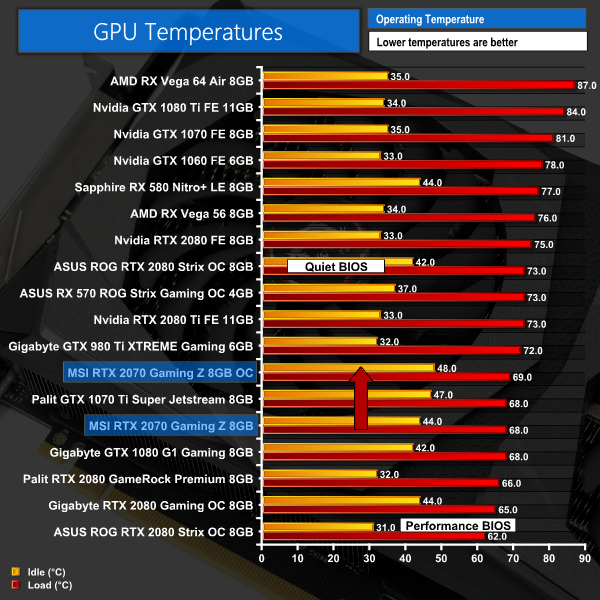 Looking at the thermals, it is impressive to see the Gaming Z only ran 1C hotter when overclocked – its noise levels barely rose as well, meaning there's very little reason not to run the overclock. Power consumption rose about 10W, which is again going to make very little difference in the real world.