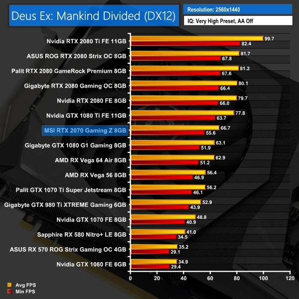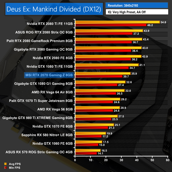 Deus Ex: Mankind Divided paints a clearer picture than the 3DMark tests – we can see the RTX 2070 sandwiched between the GTX 1080 and the 1080 Ti. The 1080, however, is not much slower at all across these three tests – with the biggest gap being just 3.6FPS at 1440p.