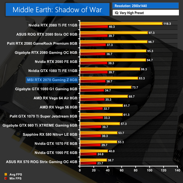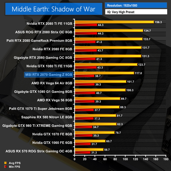 Middle Earth: Shadow of War has the RTX 2070 a lot closer to the performance of the GTX 1080 Ti than the other titles we've tested so far. For instance, it's only 6.7FPS slower at 1080p, but that makes it almost 17FPS faster than a GTX 1080.