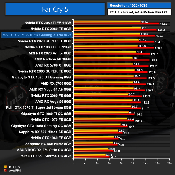 Far Cry 5 sees the MSI 2070 SUPER easily outpacing the 5700 XT, coming in a couple of frames faster than the reference-clocked Founders card.
