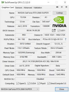 | GPU | RTX 2080 SUPER | RTX 2080 (FE) | RTX 2070 SUPER | RTX 2070 (FE) | RTX 2060 SUPER |