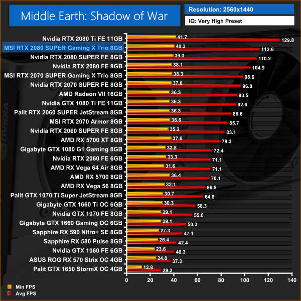 Middle Earth: Shadow of War has a 2% performance advantage for the MSI 2080 SUPER versus the Founders Edition, but that works out at just a couple of frames when gaming at 1440p.