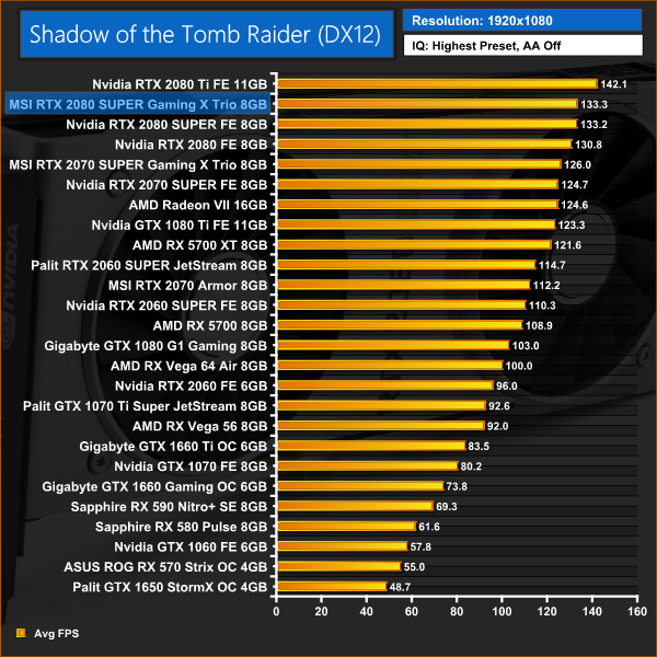 MSI's 2080 SUPER is just 1.3FPS faster than the Nvidia Founders Edition when playing Shadow of the Tomb Raider at 4K. At the same resolution, it manages an extra 4.4FPS over the original 2080.