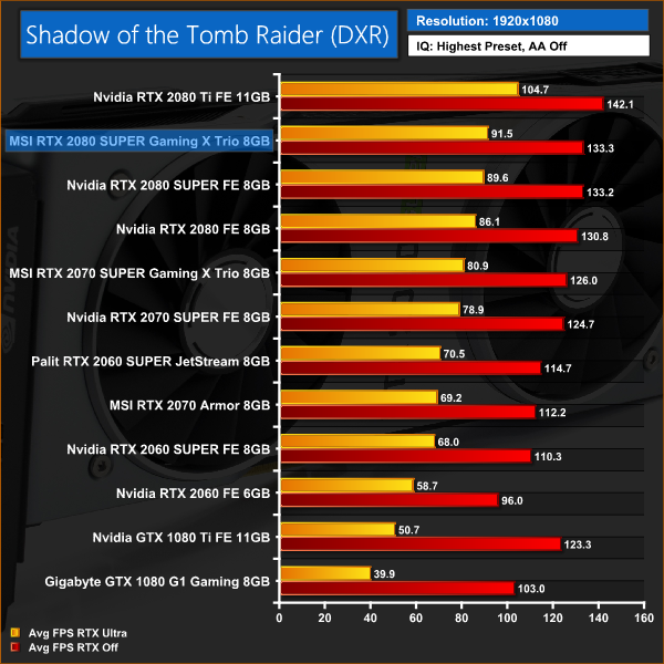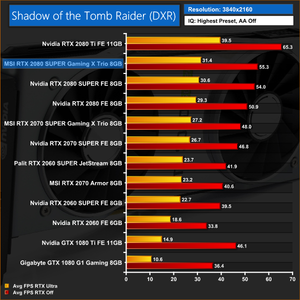 We test using the Highest preset, with AA disabled. We test using the DX12 API. For these ray tracing benchmarks, we present average frame rates for the game with ray traces shadows (DXR) off, and then again with ray traced shadows set to Ultra.