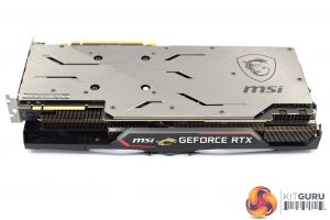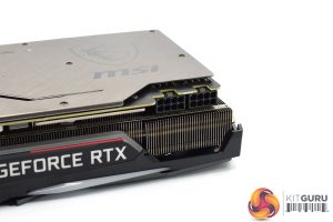 On the front side of the card we find the MSI and ‘GeForce RTX' logos, but most eye-catching is the silver backplate. This is brushed metal, but as the metal is actually brushed in two different directions, it creates a visually appealing two-tone effect depending how the light hits the card. It's one of my favourite aspects of the design as a whole.