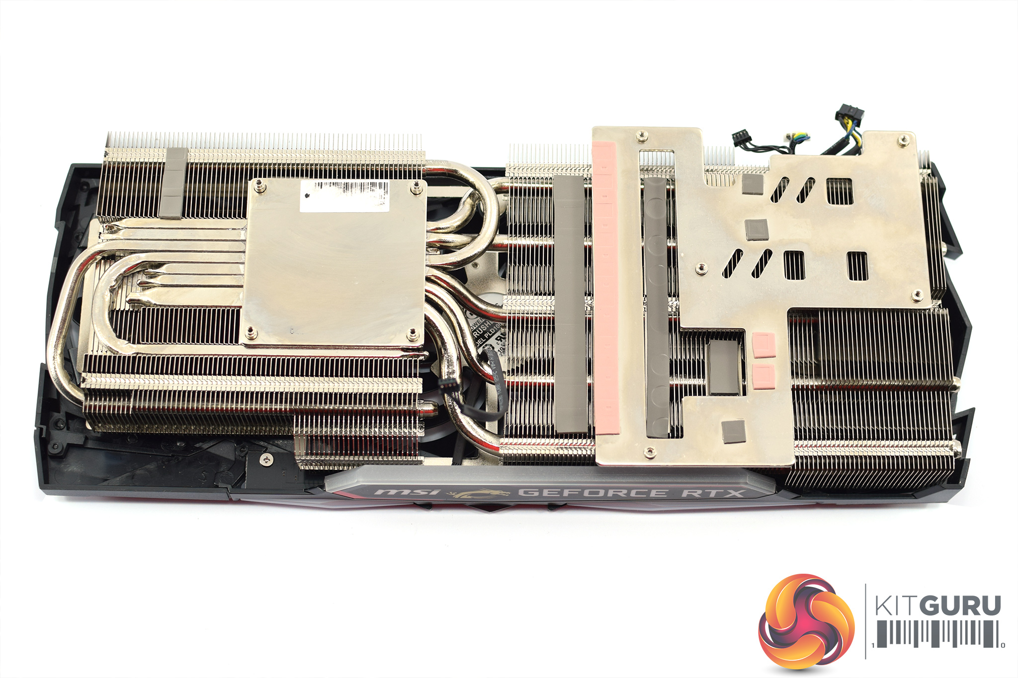 The heatsink is also the same as the 2070 SUPER, meaning it uses two separate aluminium fin stacks that are connected by 7 nickel-plated heatpipes. Of these, 6 measure 6mm in diameter and the last one measures 8mm in diameter. There's a separate coldplate for the GPU die, and another for the VRM as well with all the necessary thermal pads.
